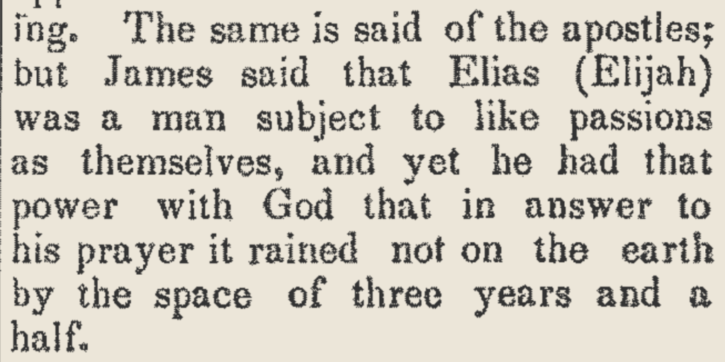 “The same is said of the apostles; but James said that Elias (Elijah) was a man subject to like passions as themselves, and yet he had that power with God that in answer to his prayer it rained not on the earth by the space of three years and a half.”